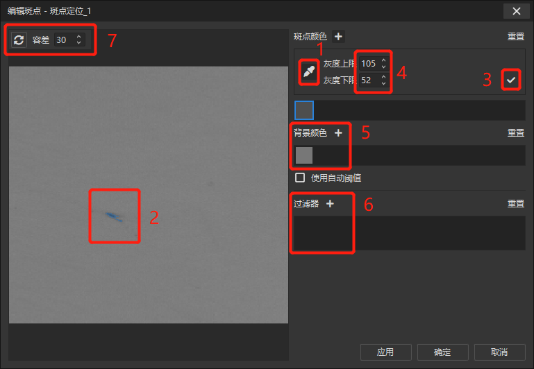 然后在参数栏打开斑点配置界面,用户可以按照以下步骤完成斑点提取,顺序与图中的序号一一对应: