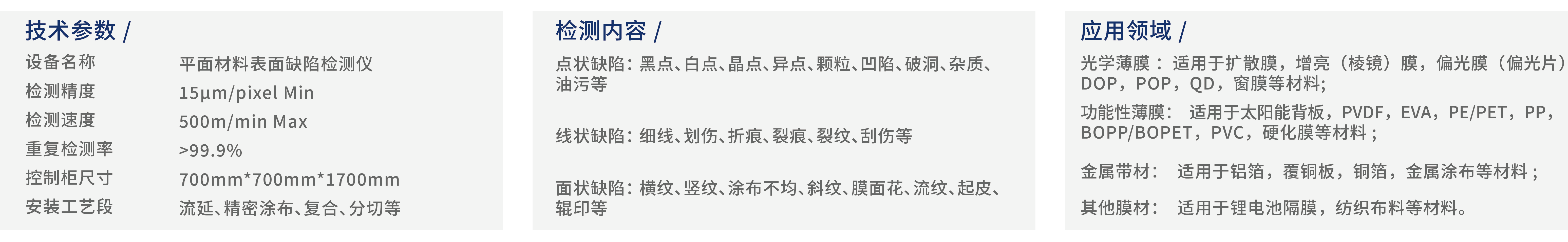 本产品采用自主研发的机器视觉技术,搭载全铝合金框架,可对平面材料存在的异点、颗粒、凹陷、破损、横纹、竖纹、涂布不均、划痕、裂痕、裂纹等几十种缺陷进行智能识别,精确记录平面材料表面缺陷的位置信息,将所记录的缺陷大小和位置以报表的形式呈现并打印,实现了平面材料在线检测的自动化和智能化,形成了企业产品质量检测的统一标准。
